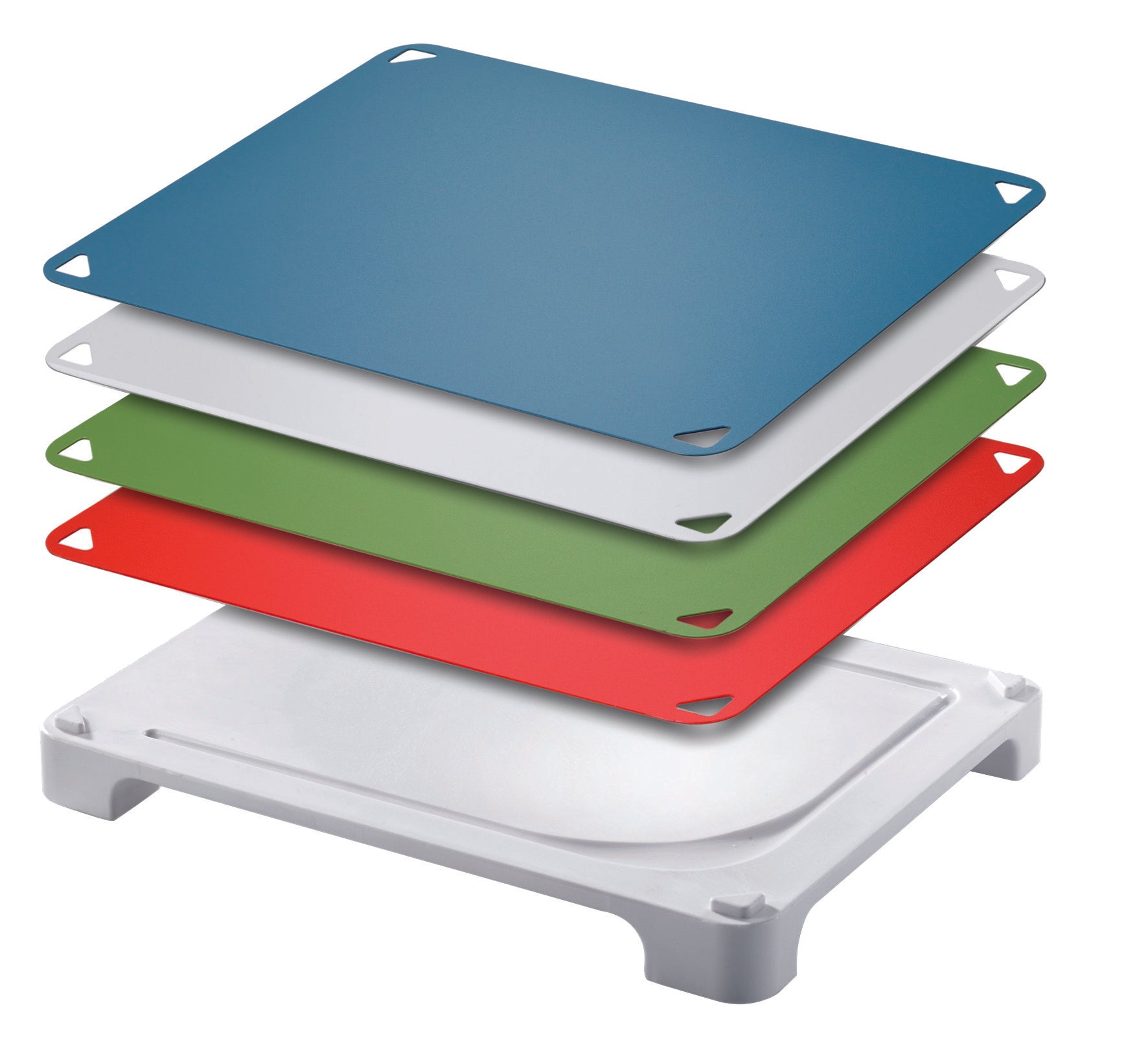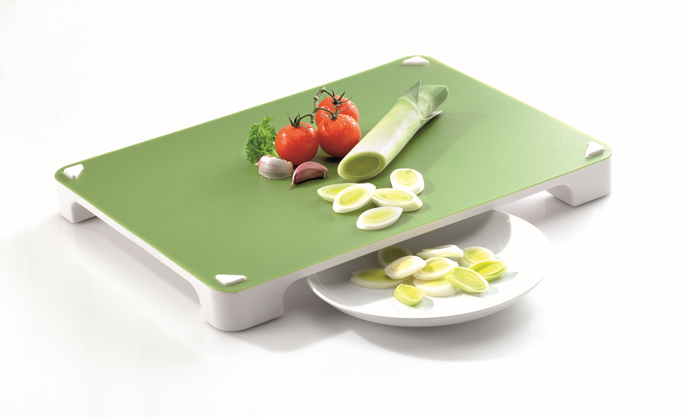 No matter whether fish, meat, vegetables bread – one cutting board is enough for all food: the Leifheit Varioboard. With its four exchangeable cutting foils it offers for every food a hygienic basis. Vegetables have to be cut on the green foil, meat on the red the blue foil is for fish and the white for bread. Because of the colours the assignment is easy and the preparation always clean and appetizing. The handling is also easy: the foils have to be put on the basis board. There they are fixed. In case the cut goods shall be transported to the pan, the foils can be used as a transport aid. The basis board has a juice groove so that the working surface remains clean. Because of the gummed feet it is non-slipping and a little bit higher: a plate can be put under the cutting goods. These goods can be put on the plate without falling down.