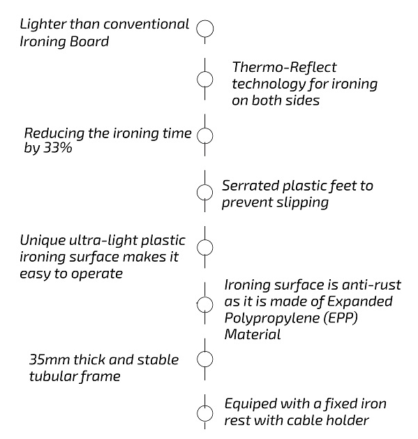 - Ultra-light ironing surface (110 x 30 cm) made with special plastic