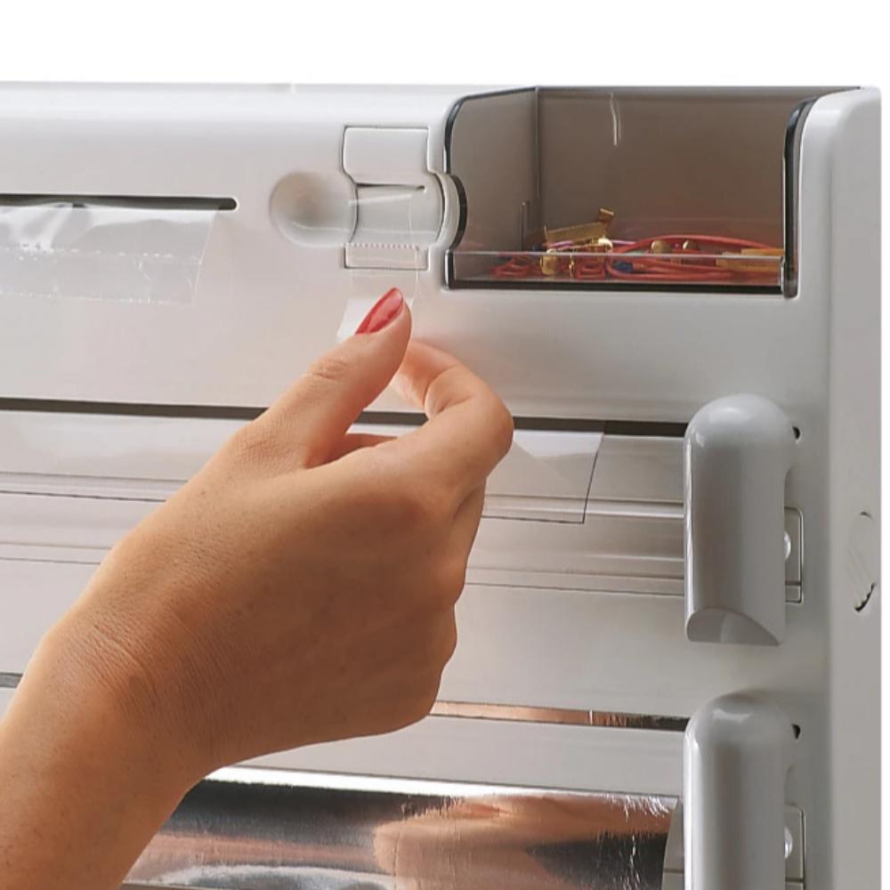 That is the way, how to work: the wall-mounted roll holder Parat Plus offers in a flash everything that is needed again in between times. Two closed containers offer space for aluminium foils and cling films. A compartment is for freezer bags. In addition there is dispenser for Sellotape as well as a box for small pieces where rubber bands, drawing pins, paper clips or clips for closing can be stored. An additional holder is for kitchen rolls. The wall-mounted roll holder Parat Plus had special blades that cut aluminium foils and cling films neat and precise, without crooked, picked tearing edges and without fiddling on the cling film, because the foil end is not found. After the cutting the foil ends are again ready to hand and can easily be cut. The razor-sharp blades are hidden behind the ergonomic shaped cutter, free from the risk of injury. After the assembly the wall-mounted roll holder can be stored from the front wall easily and comfortable. Remove the container, put the roll in and the Leifheit wall-mounted roll holder is ready for use. It is suitable for all commercial roll sizes.