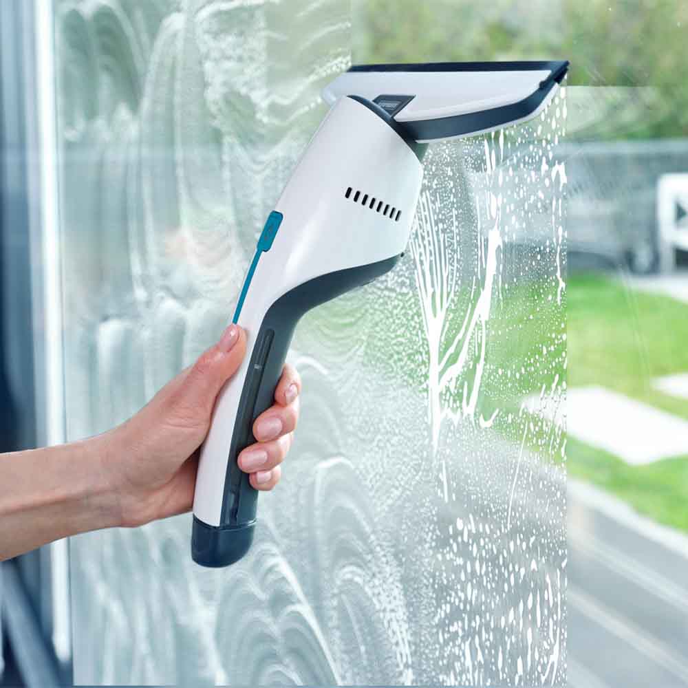 - Particularly handy and slim design: integrated tank in the handle enables vacuuming to the bottom of the window edge in one wipe